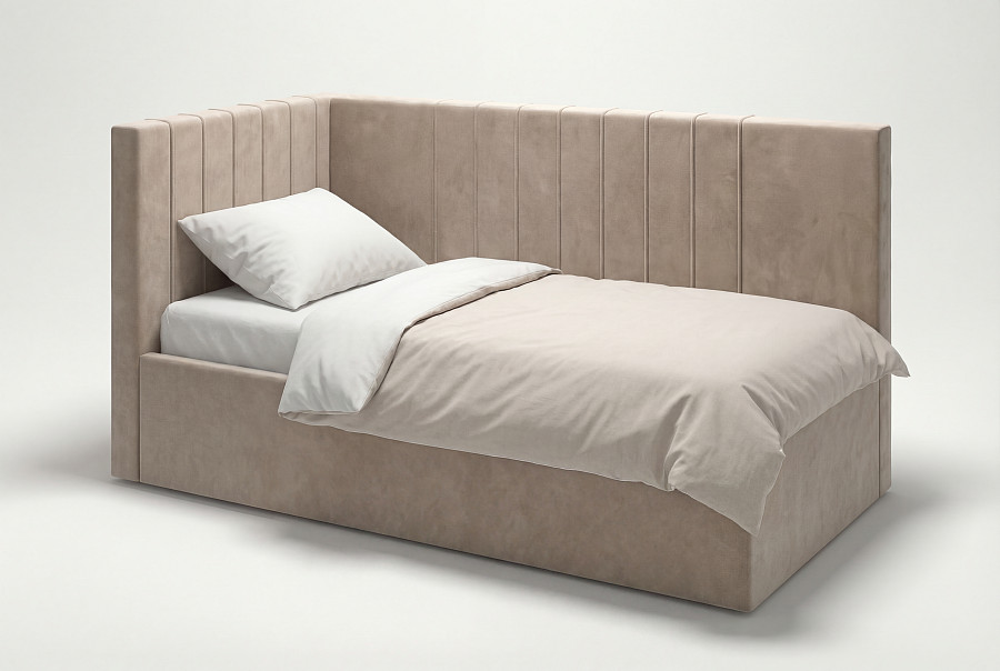 Угловая конструкция позволяет эффективно использовать пространство помещения. Стильная и утонченная модель. Возможность изготовить с подъемным механизмом – дополнительное пространство для хранения.
