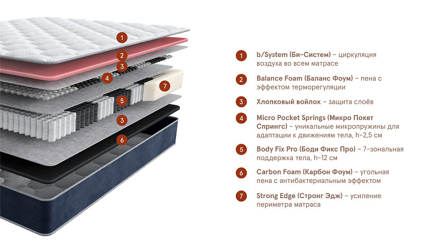 Матрас с системой циркуляция воздуха, усиленным периметром и антибактериальным эффектом. Умные пружины подстраиваются под спящего, исходя из его телосложения и движений во сне. Это трёхмерная динамическая настройка на человека, которая способна трансформироваться вместе с каждым движением и положением тела, при этом оставаясь совершенно незаметной. 7-зональный пружинный блок обеспечивает повышенную комфортность для спящего человека и идеальную поддержку каждого участка тела, максимально точно повторяя его контуры.