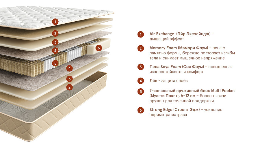 Матрас с дышащим эффектом, обладает повышенной износостойкостью и комфортом. Пена с памятью формы, бережно повторяет изгибы тела и снимает мышечное напряжение. 7-зональный пружинный блок обеспечивает повышенную комфортность для спящего человека и идеальную поддержку каждого участка тела, максимально точно повторяя его контуры.